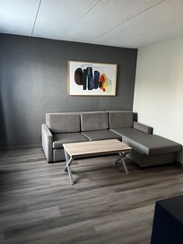 Alles sehr einfach, keine Reinigung, sehr hellhörig, die Klimaanlage von drüber tropft draußen auf das Fensterbrett und nervt.