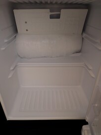 The mini fridge was in need of defrosting, huge block of ice in it. Was at room temp. Not a huge deal, but I do like to keep OJ available in the event of low blood sugar.