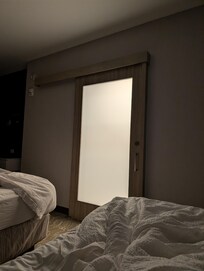 Cons: room layout, while tastefully decorated, a bit awkward in that the bathroom runs lengthwise opposite the foot of the beds, which would be fine, but the barn-style sliding door was made of material that did not block light or noise, so using the bathroom disrupted those trying to sleep. Lo-flow shower head with low pressure made the steam feel like a free dribbles, and was disappointing. Toweling for three for our party of four.